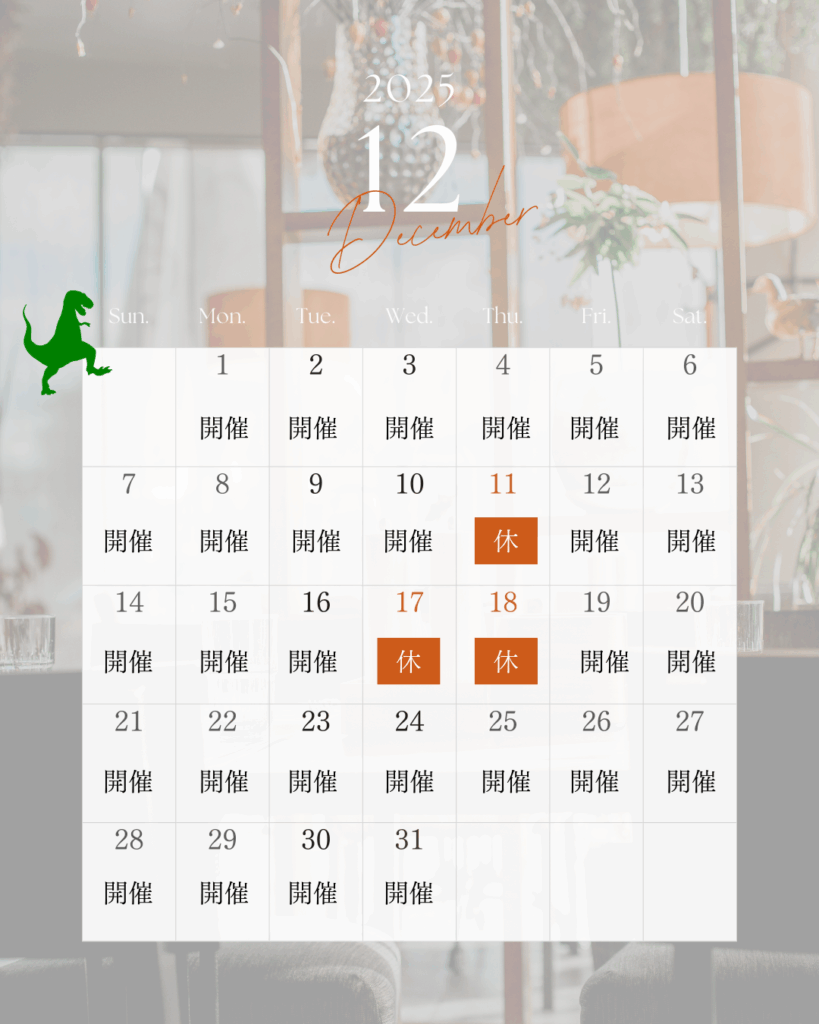 12月は11日(木)、17日(水)、18日(木)の3日間はお休みです。