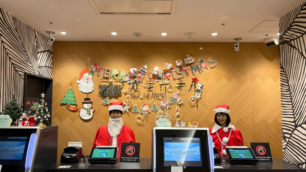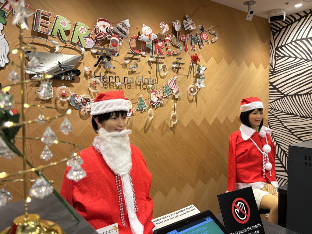 フロントのロボットたちは、サンタの衣装でお待ちしています。