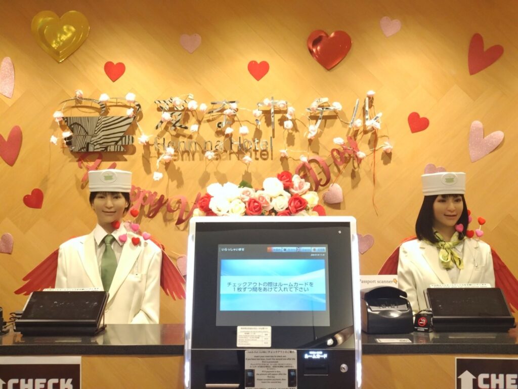 天使の羽をつけたロボットがお客様をお迎えしております。