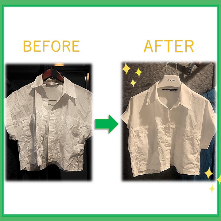 今回はそのLGスタイラーが本当に効果があるのか1日着た、しわくちゃなブラウスで実験してみました。