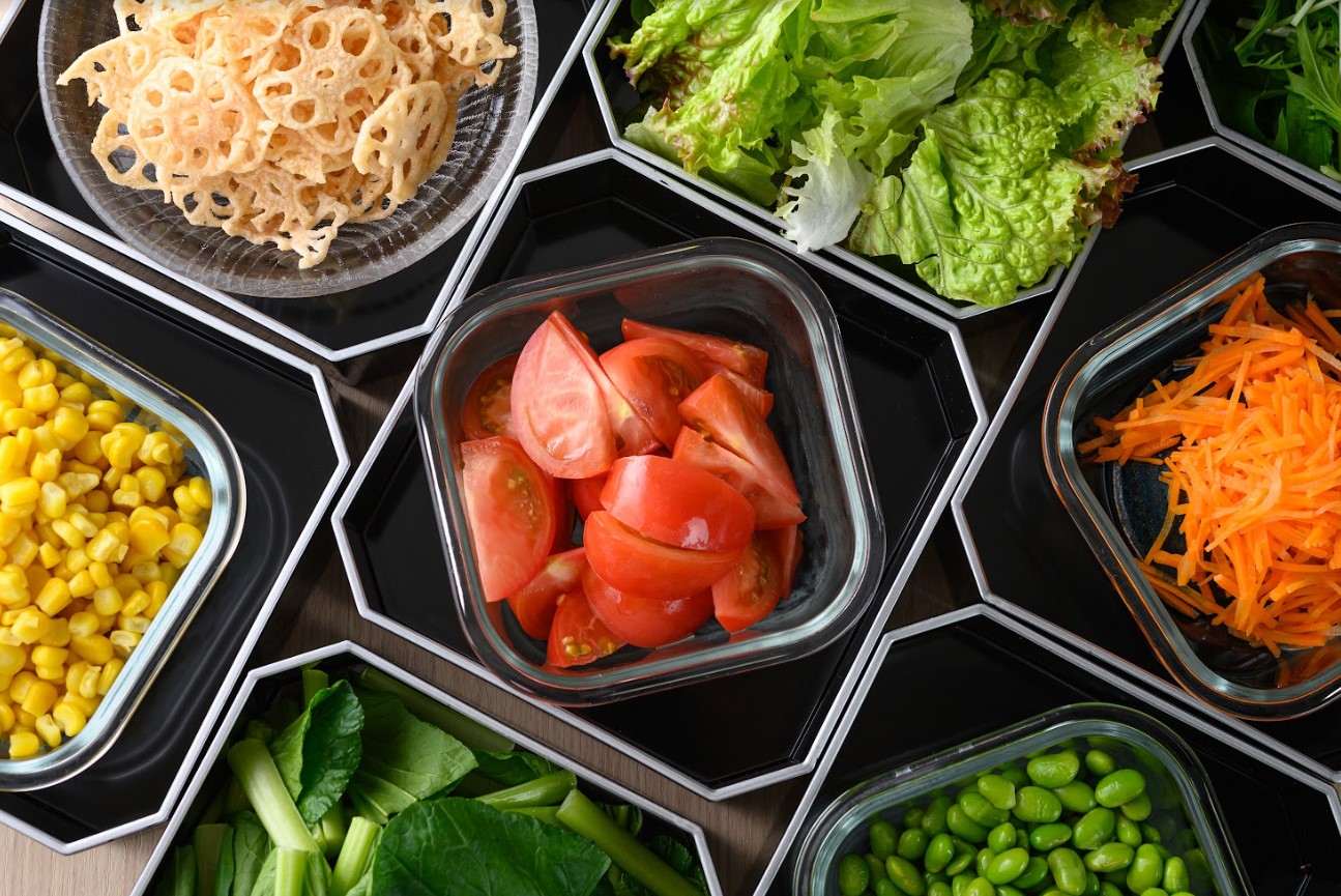 | 血行促進や老化防止の東京トマト、骨粗しょう症や生活習慣病予防に小松菜、美肌効果の水菜等をそろえた、新鮮、健康サラダバーをお楽しみください!、サラダバーはお代わり自由です♪ ※サラダバーイメージ | 疲労回復等に鶏十目ご飯、風邪予防や高血圧に十八穀ごはん、血液機能改善や疲労回復等にあさりご飯や筍ご飯、その他梅ひじきごはん、豆ごはん等から日替わりでご用意♪ お代わり自由です! ※朝食イメージ |