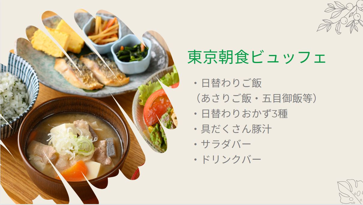 新鮮で『旬』を感じる東京野菜を中心に『健康』をテーマにした朝食を提供しております。