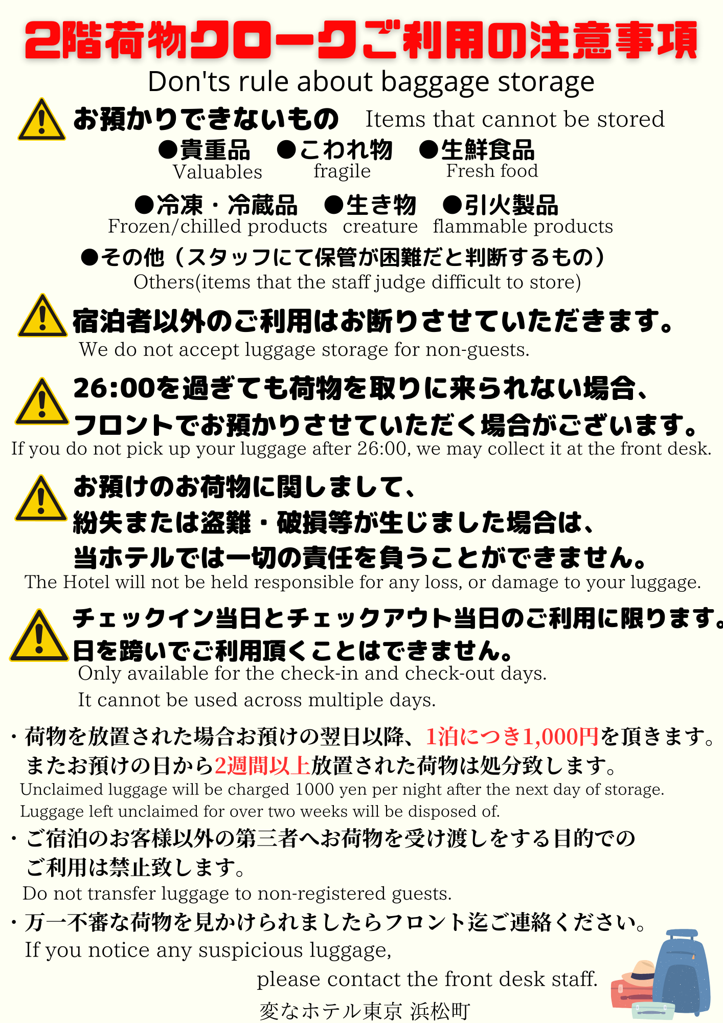 当館2階にございますお荷物お預りロッカーはチェックイン当日とチェックアウト当日であれば、 ご宿泊のお客様に限り無料でご利用可能です!