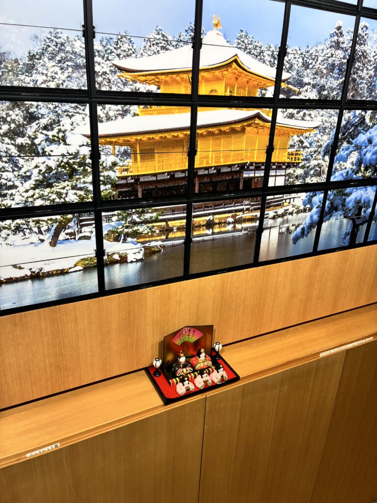 フロントにある大型フラップディスプレイの前で、ちょこんと座る小ぶりな雛人形が皆様をお出迎えします。 京都のダイナミックな風景を映し出す背景と、お内裏様・お雛様の優しい佇まいとのコントラストが、ロビー空間を春らしく温かい雰囲気に包み込みます。