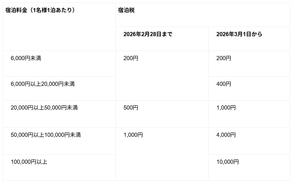 京都市では「京都市宿泊税条例」に基づき、宿泊税が課税されております。この度、京都市宿泊税の税率改定に伴い、2026年3月1日(日)のご宿泊分より以下の通り宿泊税率が変更となります。