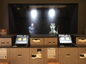 巨大スクリーンに映し出された恐竜🦖と侍が皆さまのチェックイン・チェックアウトをサポートいたします。