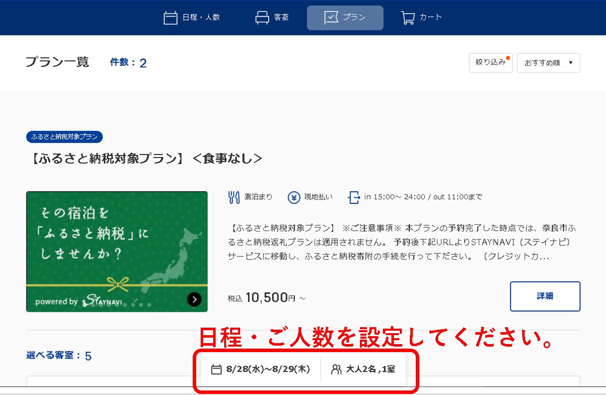 宿泊予約の際は画面の下端より日程とご人数を必ず再度ご設定くださいませ。