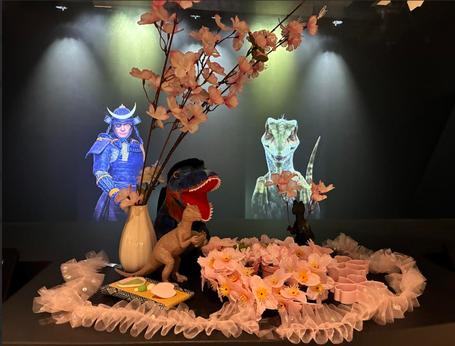 恐竜たちがお花見をしている可愛らしいデザインをお楽しみください。